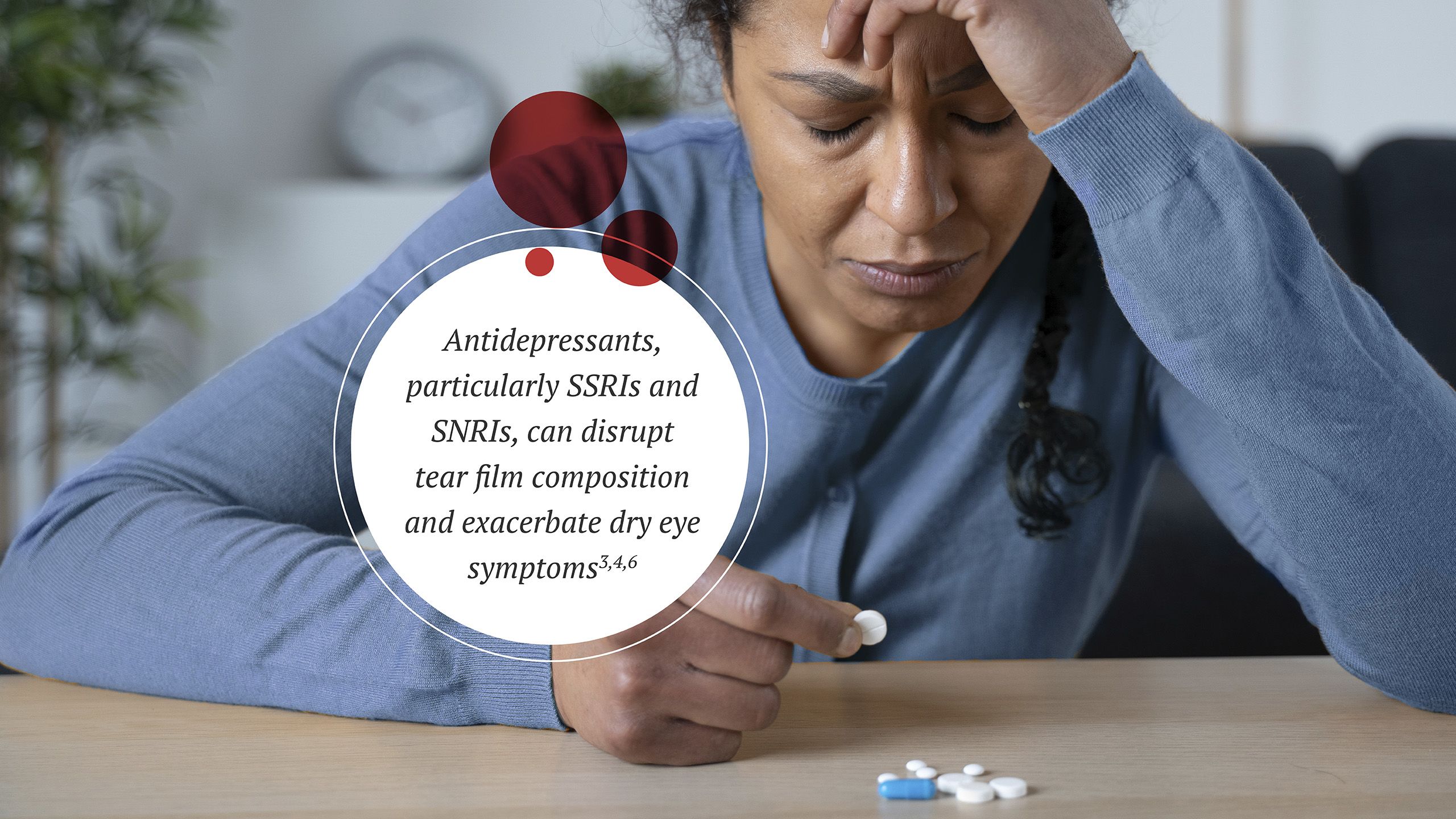• Medication side effects: Many psychotropic drugs, including selective serotonin reuptake inhibitors (SSRIs) and serotonin-norepinephrine reuptake inhibitors (SNRIs), are known to disrupt tear film composition and impair lacrimal gland function.7,8