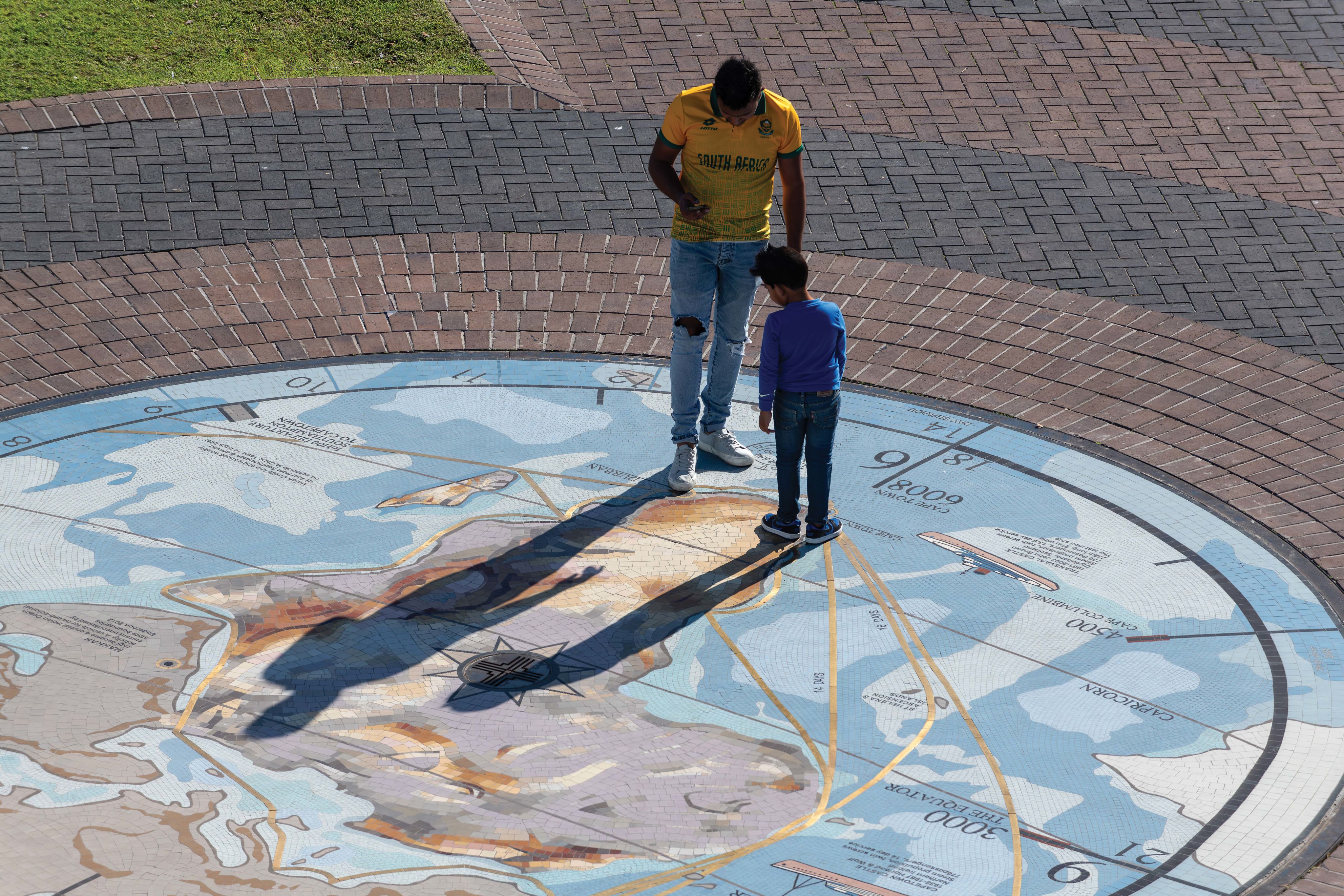 The 6,008-mile journey from Southampton to Cape Town, varying from 42 to 14 days, is commemorated through brass strips representing sea routes, with major stops highlighted in brass rings. The South African postage stamp motif nods to the building’s 1919 opening, while the paving pattern of concentric circles radiating from Union Square creates visible connections across the public spaces.