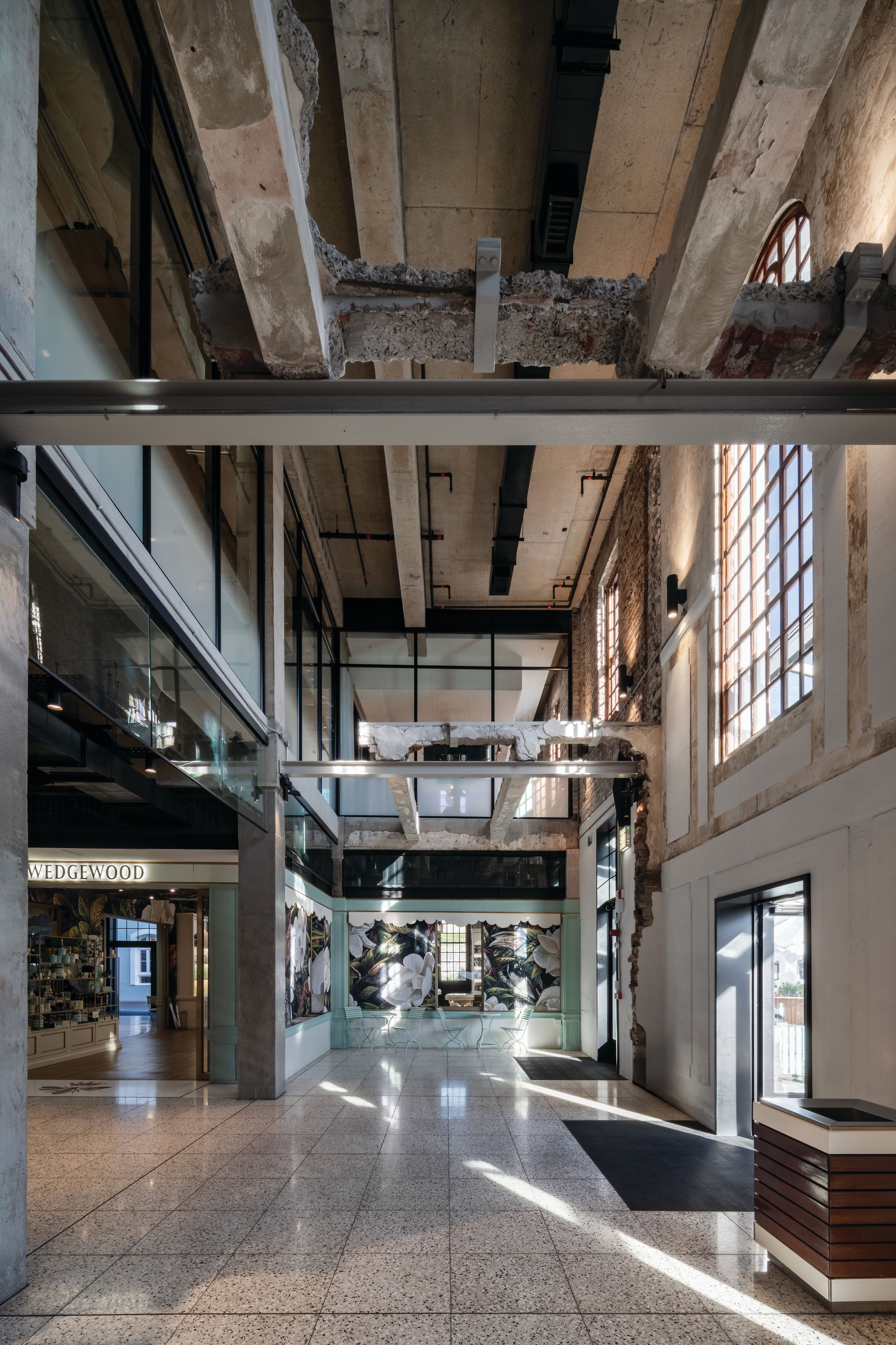 The architectural strategy directly facilitated these commercial requirements through the free-flowing ground floor, the dramatically pulled-back first floor creating double-height volumes with filtered light, and the bespoke glazed pavilion addition, which maximises location and panoramic views. The contrast between heritage and modern elements – preserved roof sections, clerestory lighting, and triple-height volumes – creates an enriched retail environment framed by the building’s layered history.