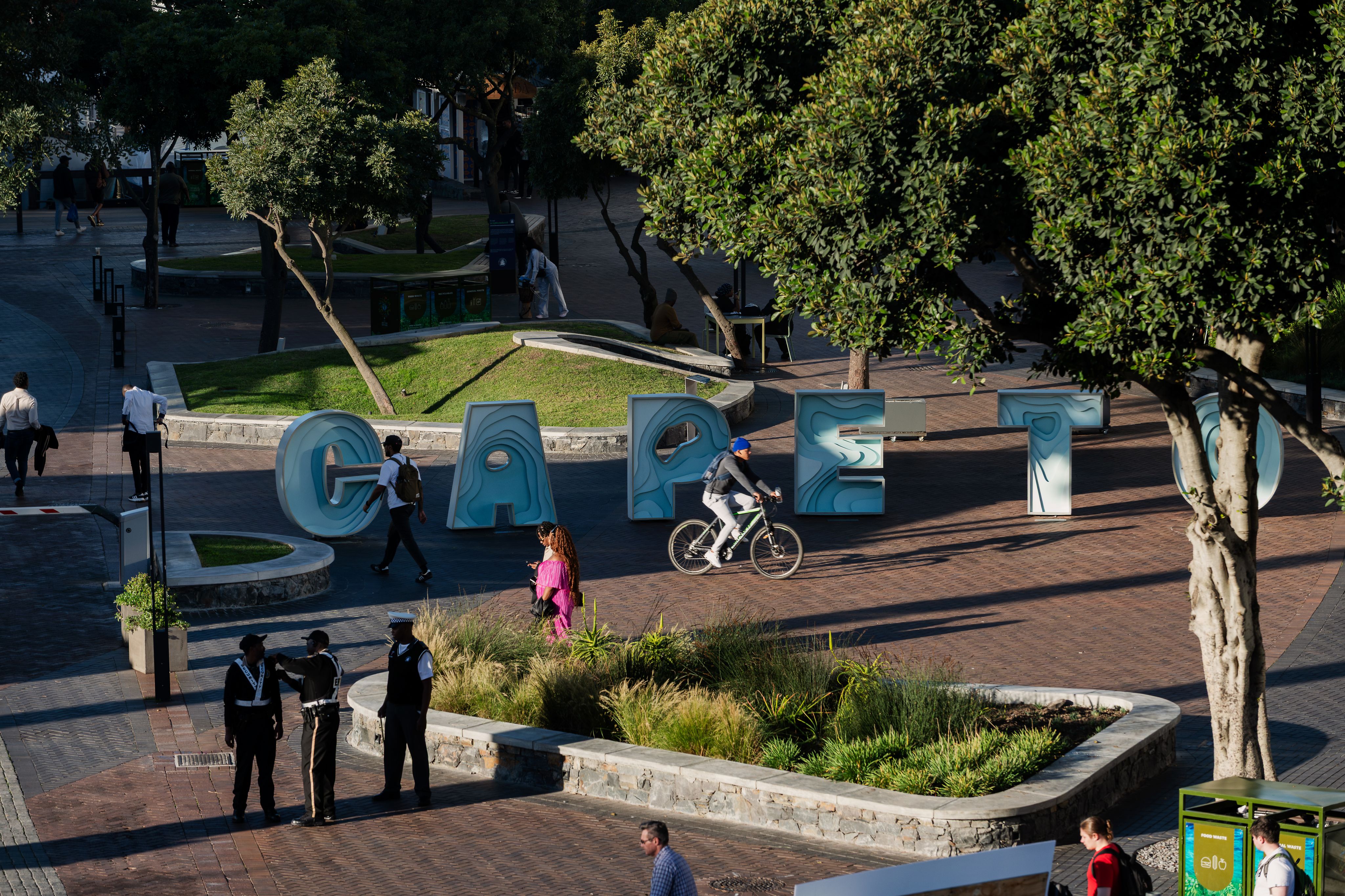 Alfred Plaza received equally thoughtful treatment, becoming home to the iconic ‘Contours of the Cape’ sign inspired by the region’s topography. Planters with built-in seating, constructed from reused Balau decking and clad with salvaged shale, house indigenous Cape Flats Dune Strandveld, Ericaceae, Peninsula Granite Fynbos, Proteaceae, and Restionaceae. The revitalised space now serves as an improved backdrop for busking and performance activities, historically prominent in the precinct.
