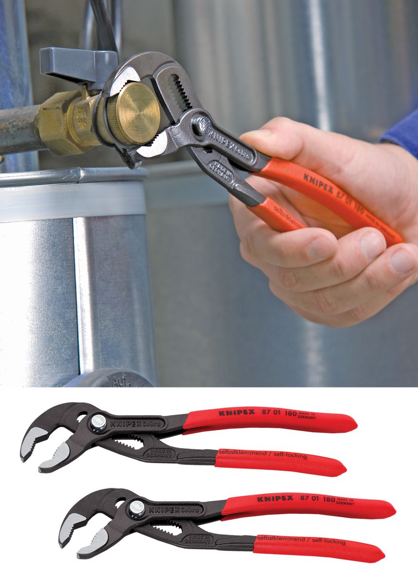 ● Cobra Water Pump Pliers (180mm): Self-clamping jaws and fine adjustment for a secure, ergonomic grip.