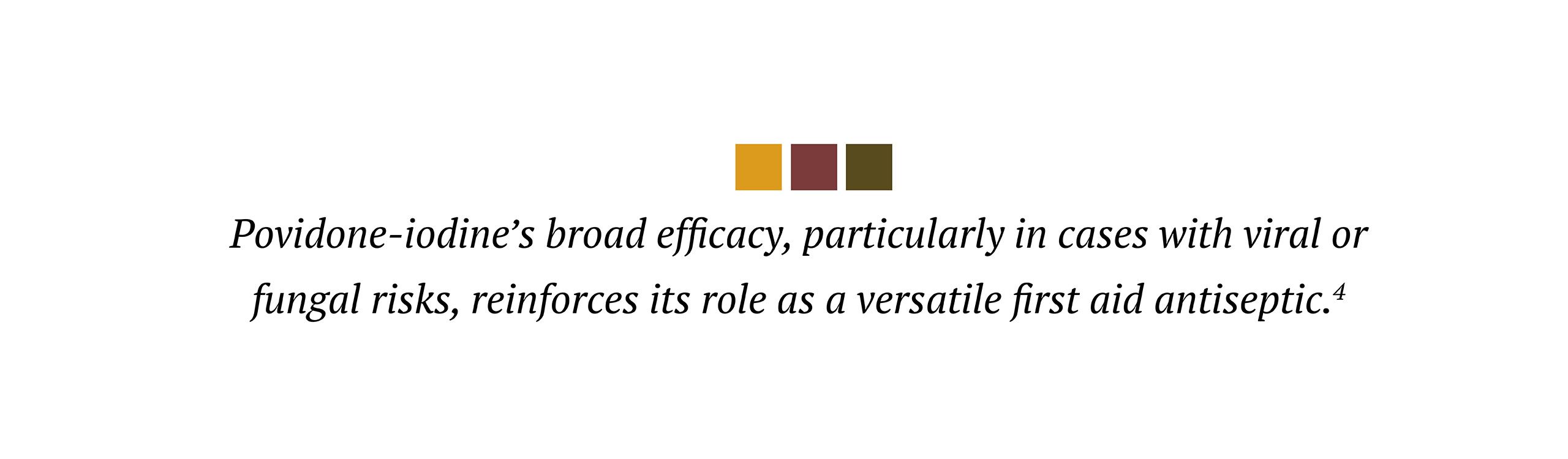 Pharmacists may encounter caregivers opting for alternatives like chlorhexidine, which has a lower risk of skin irritation and systemic absorption issues. However, chlorhexidine’s narrower antimicrobial spectrum makes it less effective against fungi and viruses. PVP-I’s broad efficacy, particularly in cases with viral or fungal risks, reinforces its role as a versatile first aid antiseptic.4