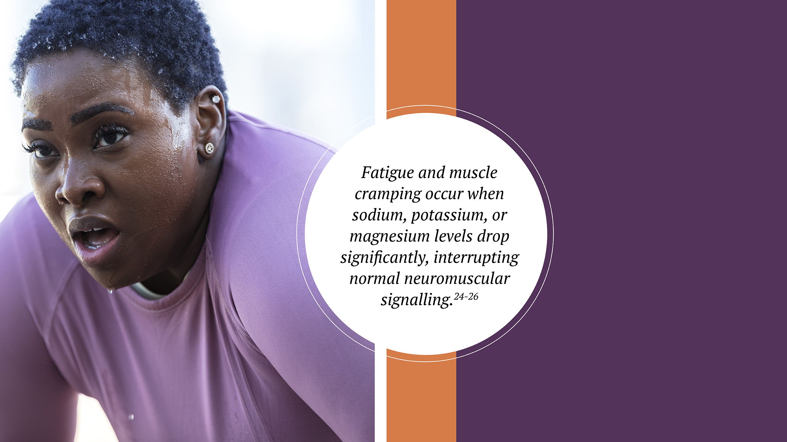 Electrolyte deficiencies can have cascading effects. Fatigue and muscle cramping occur when sodium, potassium, or magnesium levels drop significantly, interrupting normal neuromuscular signalling.24-26 Sodium imbalances can impair muscle function by disrupting the depolarization phase of action potentials, reducing excitability and interfering with effective contraction, particularly in skeletal muscle.27-29 Low magnesium interferes with calcium uptake, promoting involuntary contractions and increasing muscle fatigue.5
