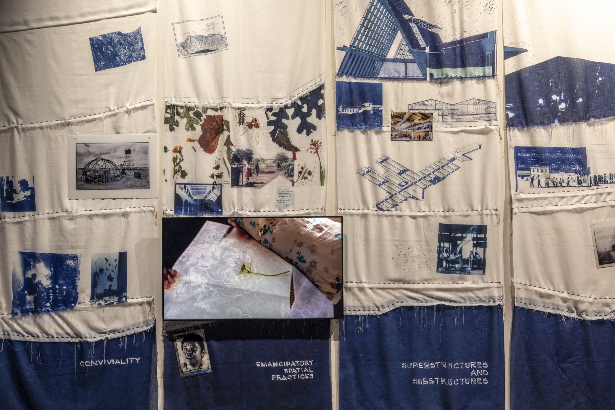 Sumayya Vally of Counterspace, well known as the first South African to be invited to design the Serpentine Pavilion, featured prominently at the main exhibition. Her installation, The African Post Office, is a speculative proposal that imagines an intercontinental infrastructure of gathering. A vertical ‘post’ is the most essential element of architecture that convenes gatherings, from totems and prayer staffs to minarets and sound systems. By playing with the double meaning of ‘post’, a vertical element and communication mechanism, it takes the form of an actual office. It brings together African communities, their diaspora, and the Venetian Lagoon through rituals of musical performance, convened by various ‘posts’ from across the continent.